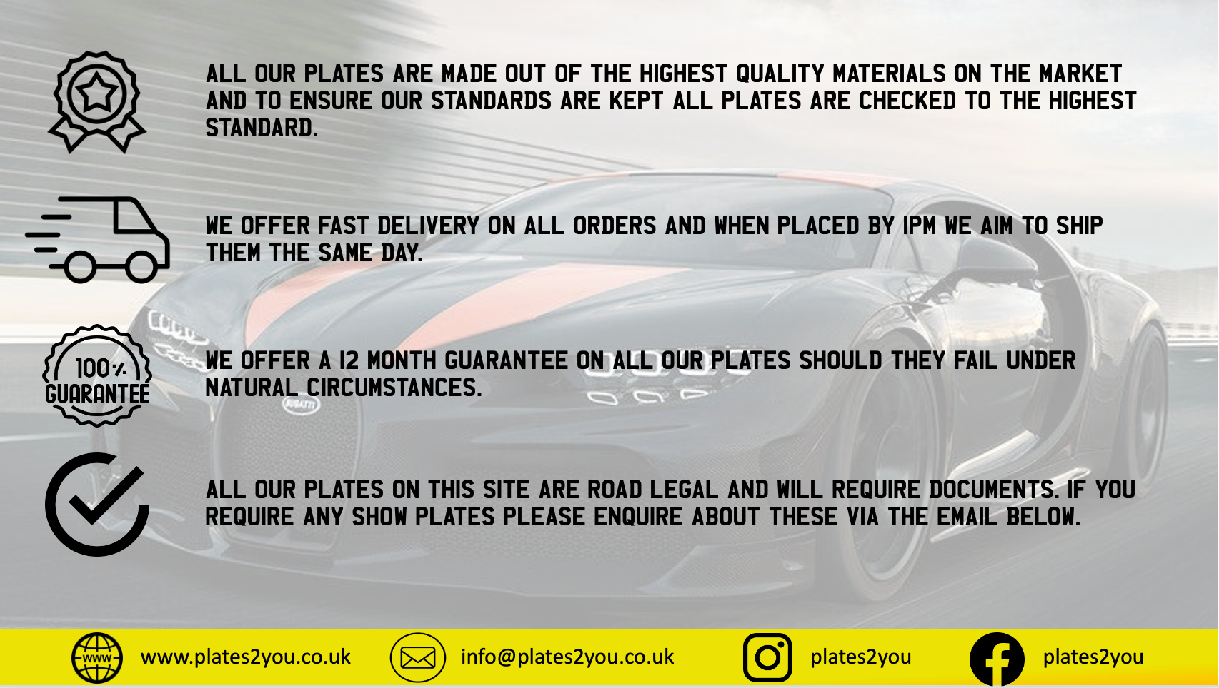 First established in 2018 as a local car accessories shop plates2you became established with an online presence in 2020 and is now a market leader in producing the best quality number plates. Our range is constantly growing from standard plates, 3D gel, 4D and now the most recent addition is our Hexagonal Lamborghini plates which are becoming more popular across car communities across the United Kingdom giving cars a more premium and sporty look to them.